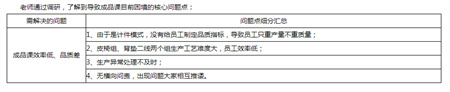 成品課核心問題點的分析。該家具廠所有人對于成品課效率低、品質差,瓶頸工序在皮椅組、背墊二線都心知肚明,但是無人再深入分析;邦有道管理咨詢師通過調研,了解到導致成品課目前困境的核心問題點,具體問題分析如圖:
